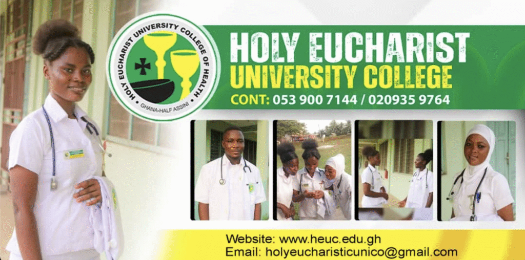 About School Holy Eucharist Univeristy College (HEUC) is unique and the first of its kind in the Western Region where BSc students have the advantage of pursing continuous four-year degree programmes in General Nursing, Midwifery, Community Nutrition and Health Promotion. Other degree programmes offered at HEUC are BSc IT and BSc Computer Science.